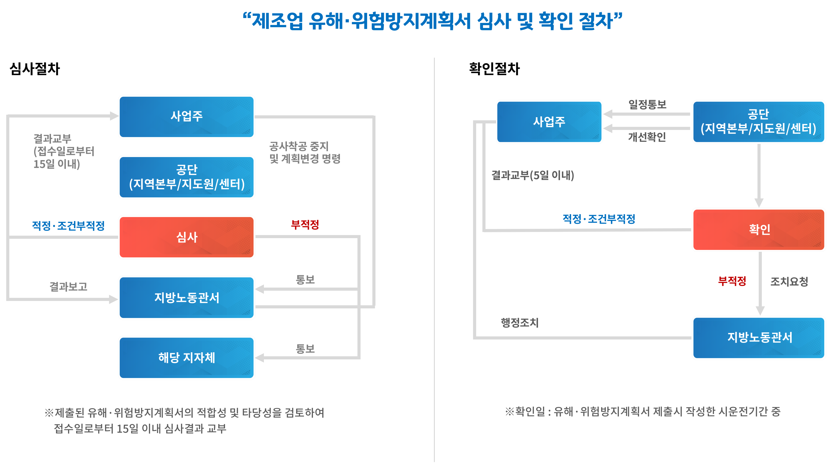 산업안전보건법 제42조(유해위험방지계획서의 작성 · 제출 등) 의거 생산 공정과 직접적으로 관련된 건설물ㆍ기계ㆍ기구 및 설비 등 일체를 설치ㆍ이전ㆍ변경하기 전에 유해ㆍ위험방지계획서를 작성ㆍ제출 하고 현장확인을 통해 유해·위험요인을 제거함으로써 산재예방 및 근로자 안전보건의 유지·증진에 기여하기 위한 법정 제도