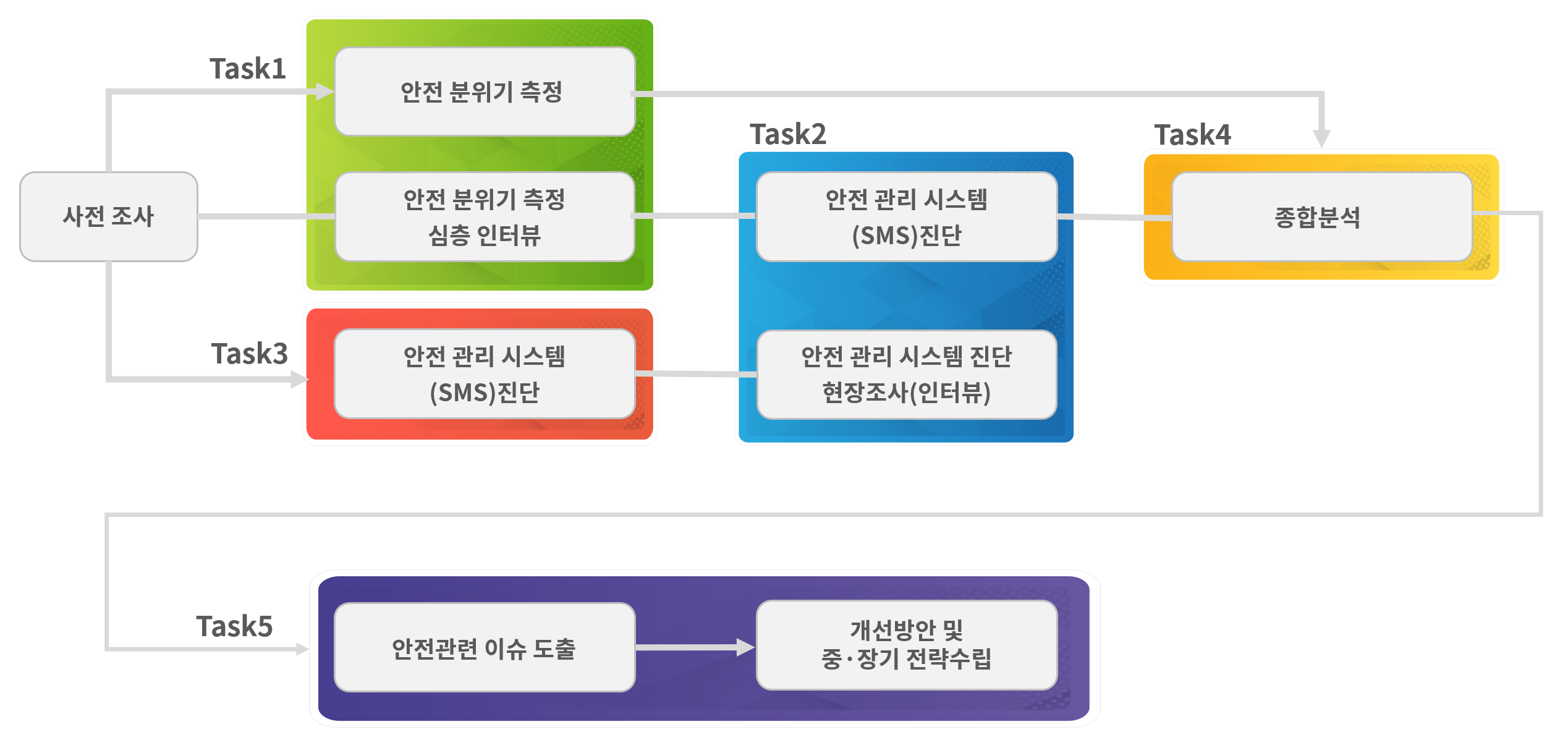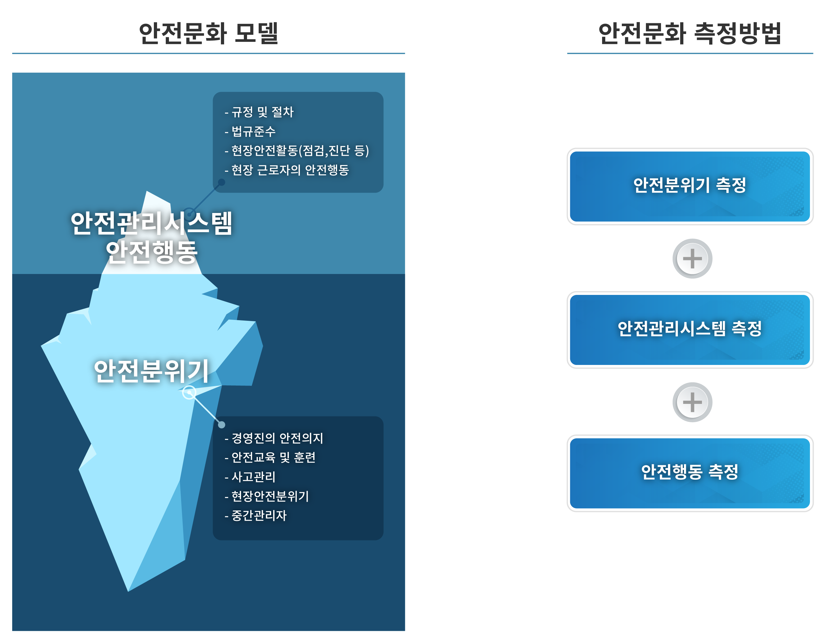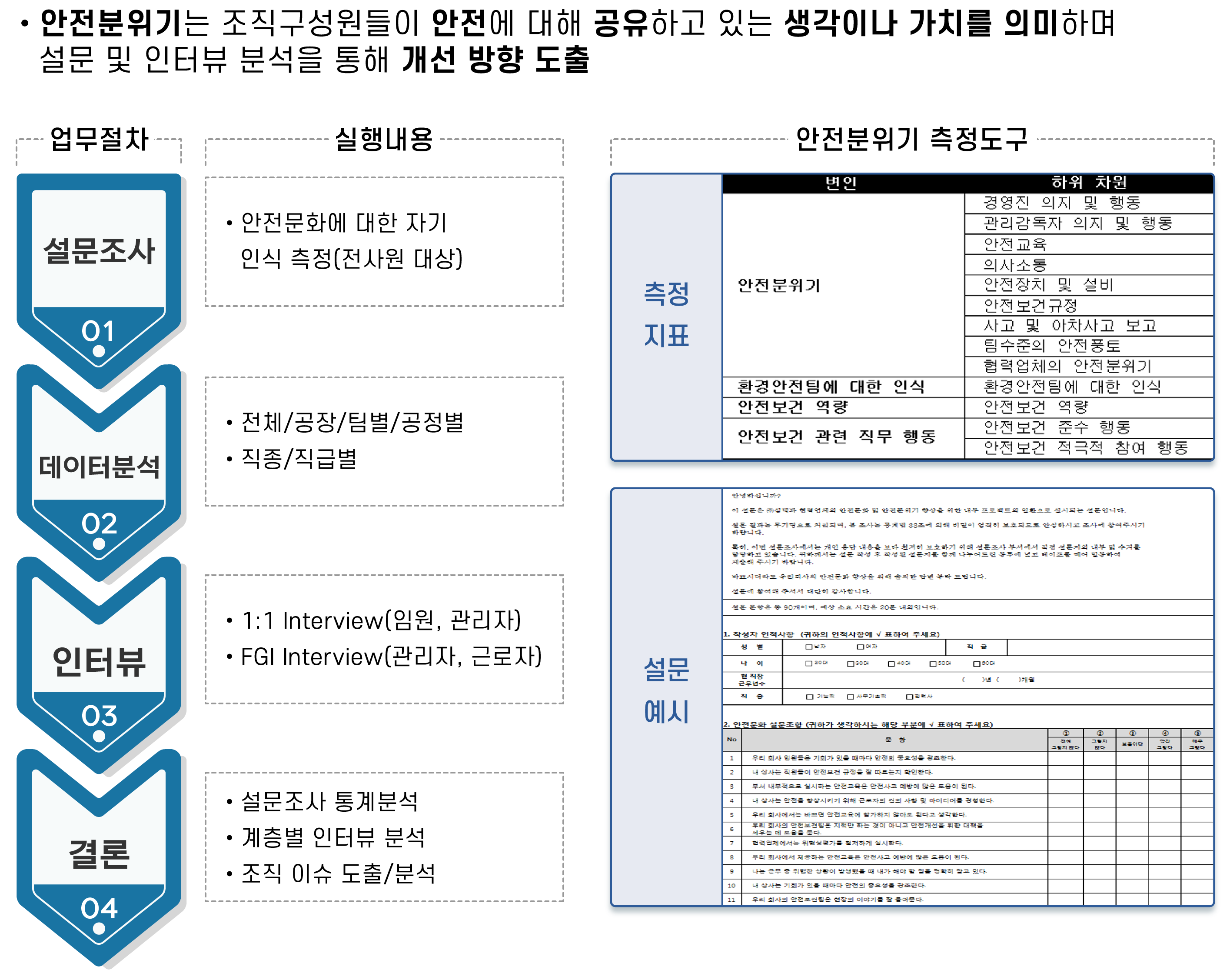 “안전문화 측정” 안전분위기, 안전관리 시스템 및 실제 안전이행 실태를 함께 점검, 진단하고 이에 대한 개선방안 및 중·장기 전략 수립