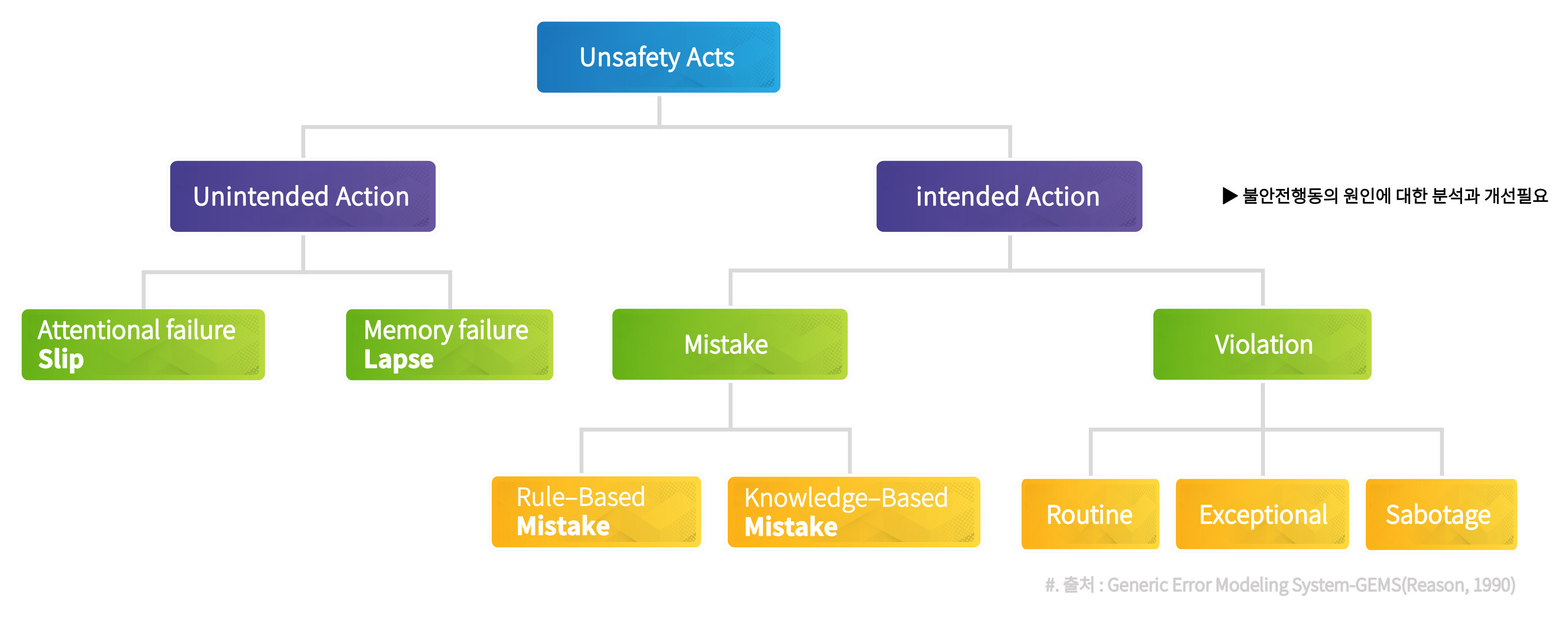 | 의도적 행동 | 규칙기반착오(Rule-Based Mistake) | 처음부터 잘못된 규칙을 기억하거나 정확한 규칙을 상황에 맞지 않게 적용 |