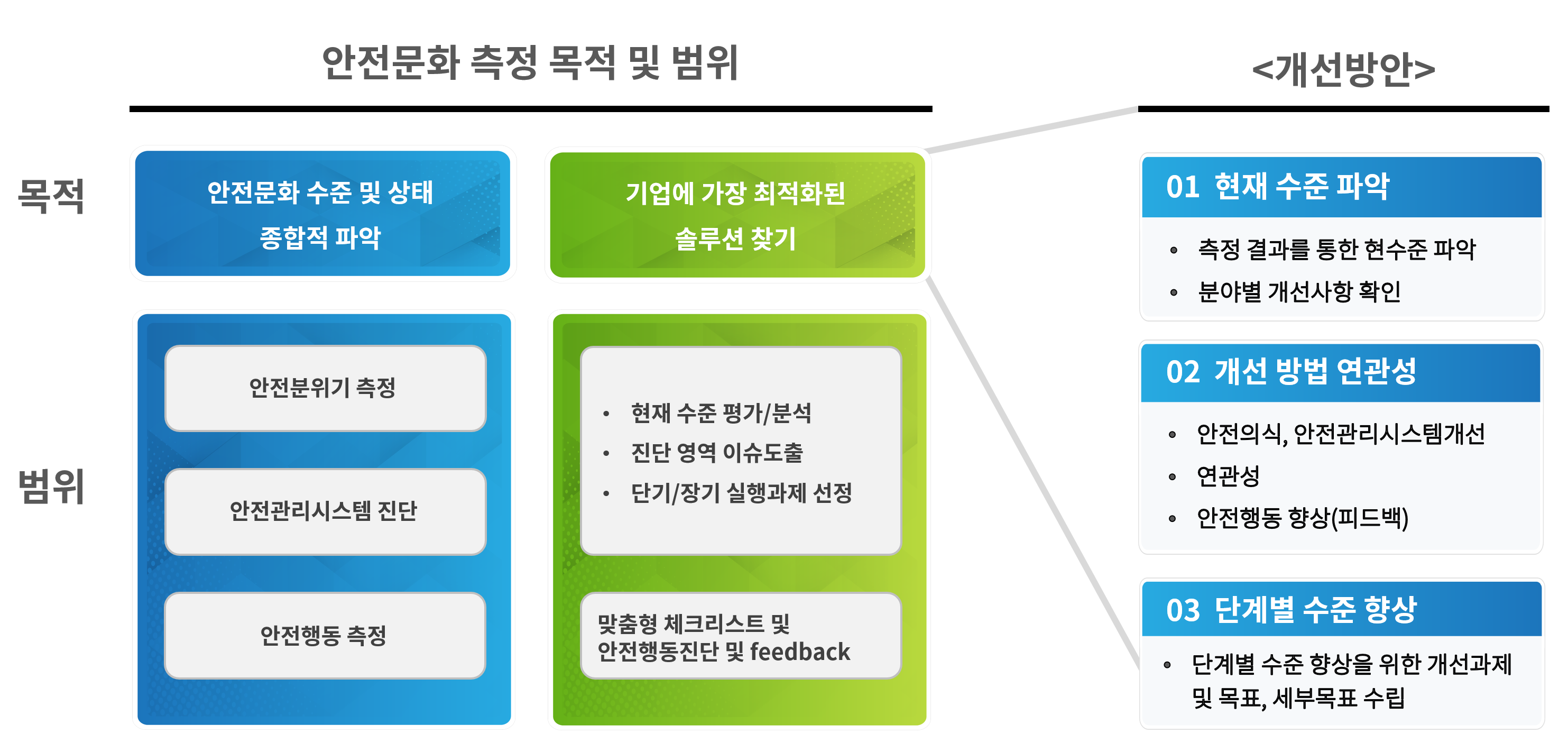 안전문화 측정은 기업의 안전분위기, 안전관리시스템, 안전행동을 진단하고 종합적인 분석을 통해 기업에 가장 최적화된 안전문화가 정착될 수 있도록